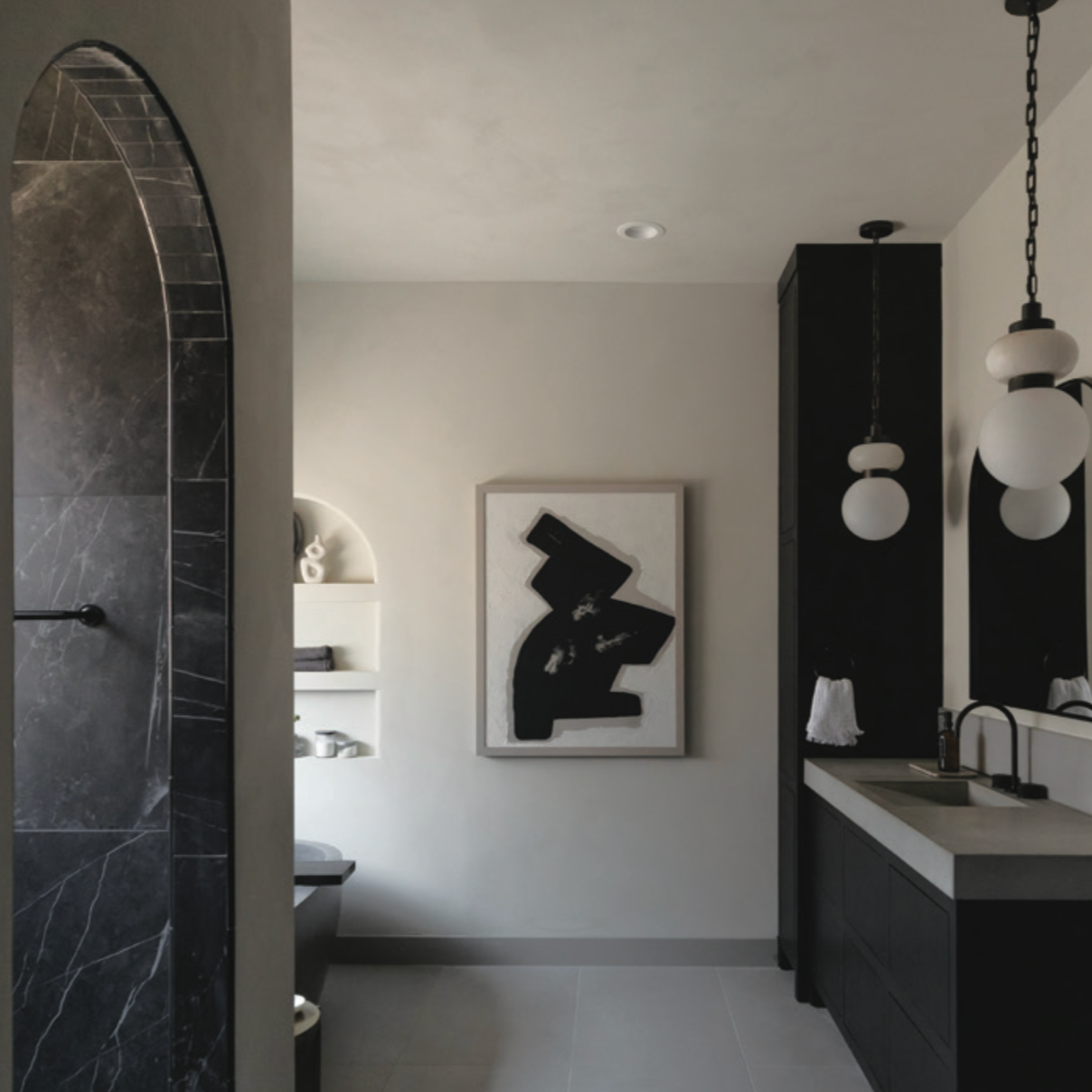 The design team recreated the old shower archway, alluding to the house’s original Mediterranean vibe, and clad its soffit with black marble-simulating porcelain tiles, which continue onto the shower walls. Arches repeat in the vanity mirrors, faucets, new shower enclosure window and integrated shelving niche at the tub, but beyond referencing Mediterranean architecture, they serve another purpose. Knowing that one day the client will introduce a significant other, Lerner made sure to add softer elements into the primary bath so it wouldn’t read too masculine. All the arches, limewashed walls, ovoid tub and rounded alabaster pendants above the vanities contribute to this effort.
