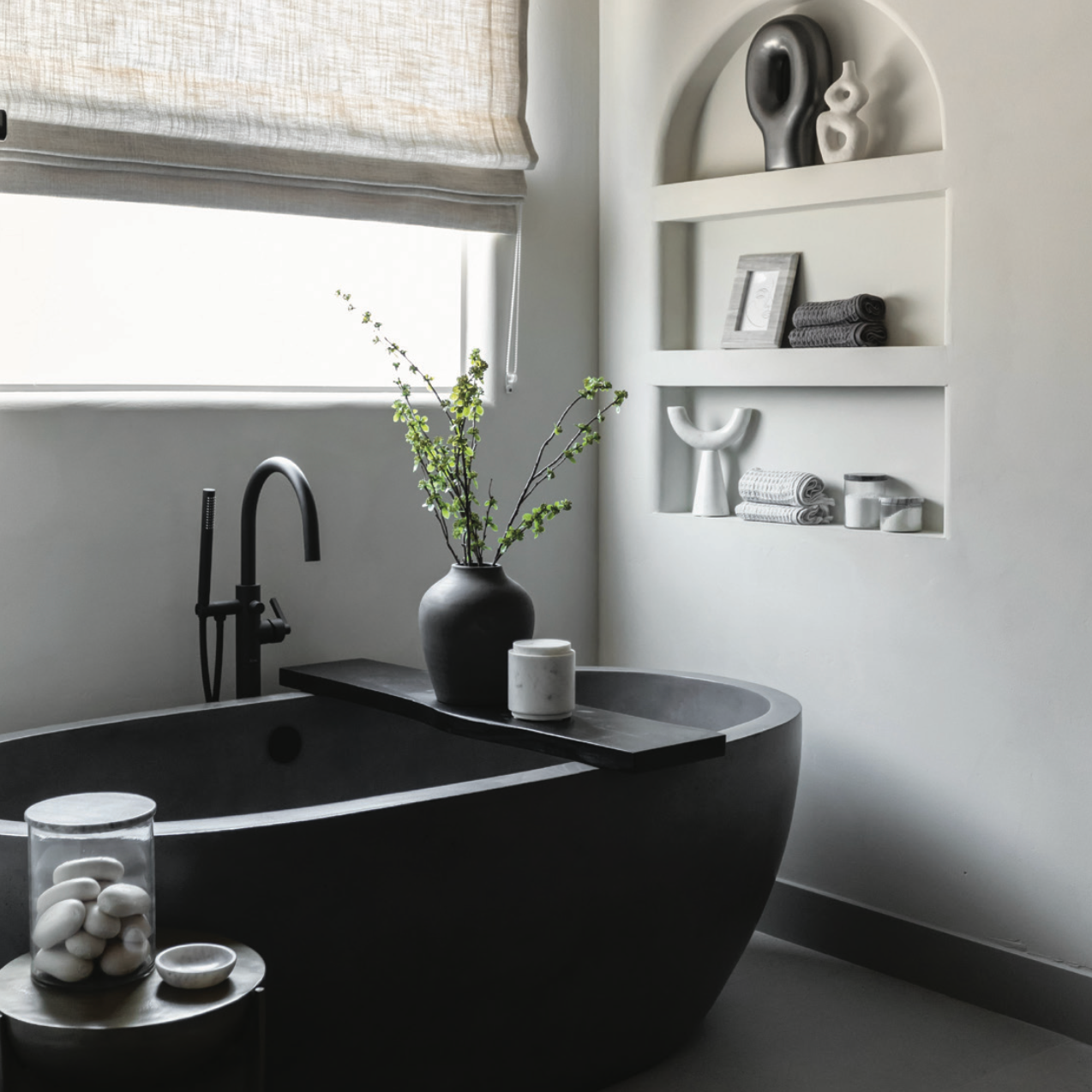 According to the designer, the client hasn’t singled out one favorite element of his new bath, but he emphatically approves of the overall uniqueness of the wabi-sabi aesthetic here and throughout. Finally, his first house feels like home.